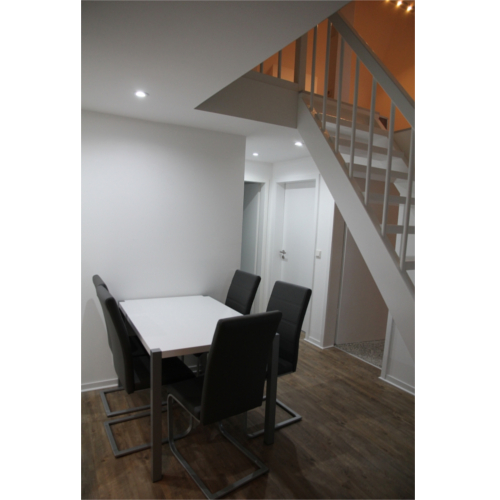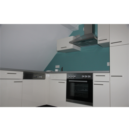 Komplett möblierte, moderne Einbauküche mit Hochglanzfront, Spülmaschine, Kühlschrank mit Gefrierfach, Ofen mit Ceranfeld und Dunstabzugshaube, Mikrowelle, Wasserkocher, Besteck, Töpfe, Schüsseln, Gläser, Becher, Tisch, Stühle ...