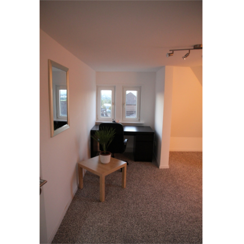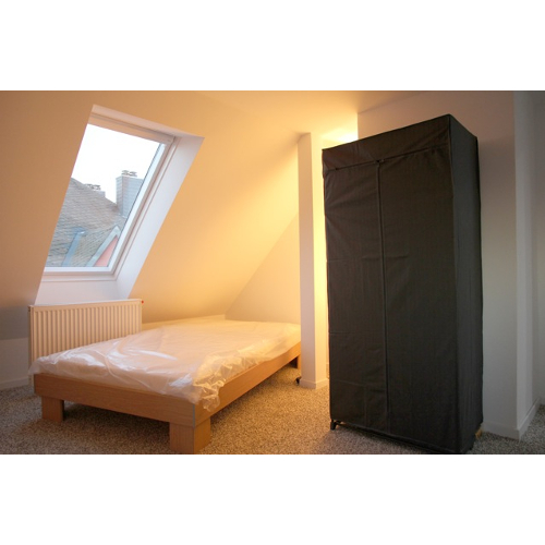 Zu jedem Zimmer gehört ein Bett mit Lattenrost, ein Schrank, ein Wandregal, ein Schreibtisch und ein Bürostuhl.